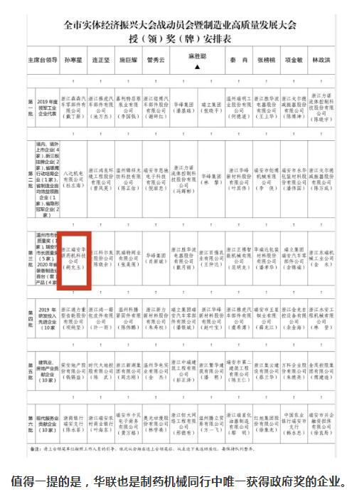 6月10日上午,全市实体经济振兴大会战动员会暨制造业高质量发展大会在瑞安市政会议中心隆重召开。会上,华联药机荣获“2020年度浙江省装备制造业重点领域首台(套)产品企业”,受到瑞安市政府隆重表彰。